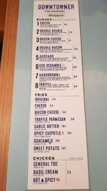 다운타우너의 메뉴와 가격대는 위와 같다. 8종류의 버거들과, 프라이즈, 치킨 몇 종류로 구성되어 있다. 가격대는 수제버거 치고 무난한 수준.