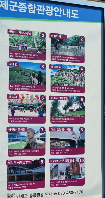 내려가는 길에, 다음엔 속삭이는 자작나무 숲과 곰배령, 내린천 등 다양한 액티비티와 즐길거리가 많아 보이는 인제를 따로 여행해보자 하며, 관광 안내도를 찍어뒀다.