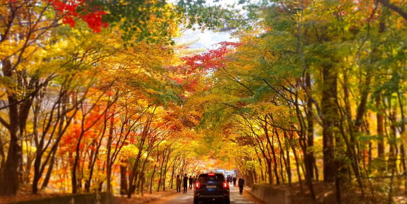 울긋불긋 터널을 이룬 단풍나무들이 바람에 나부끼며 단풍비를 내린다.